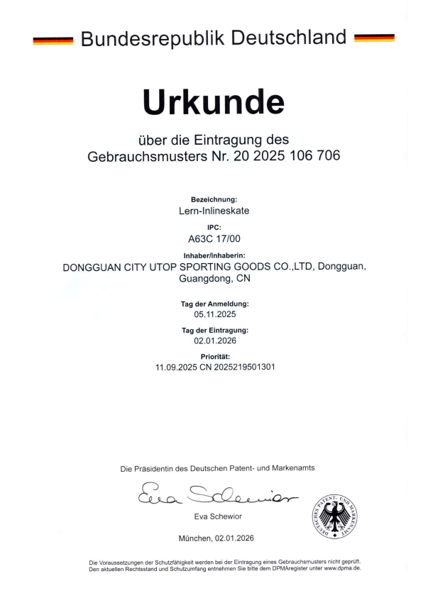 UTOP UT3008 training skate has been awarded a German utility model patent, featuring an innovative quad design and upgraded 58×24mm front wheels that provide slight steering and shock absorption for advanced beginner skaters.