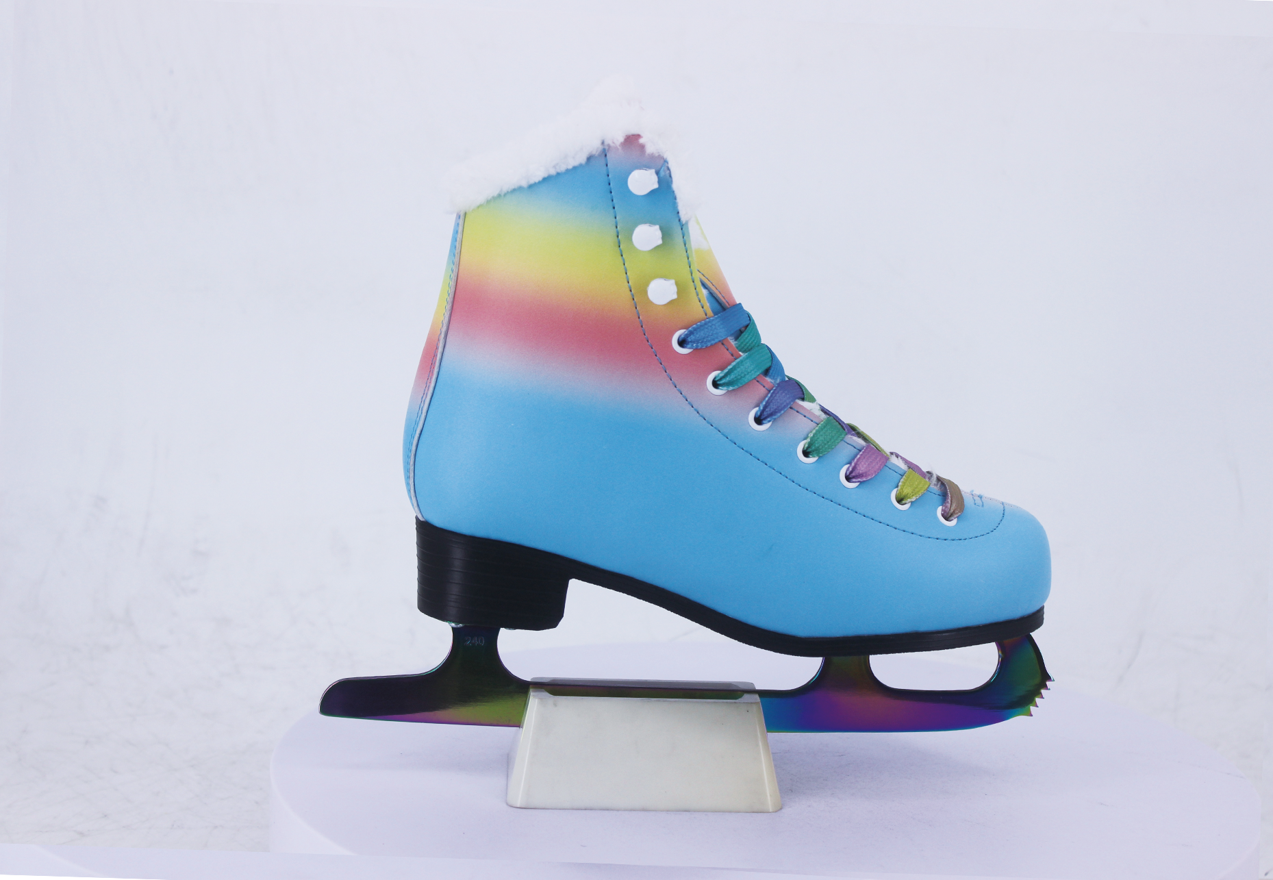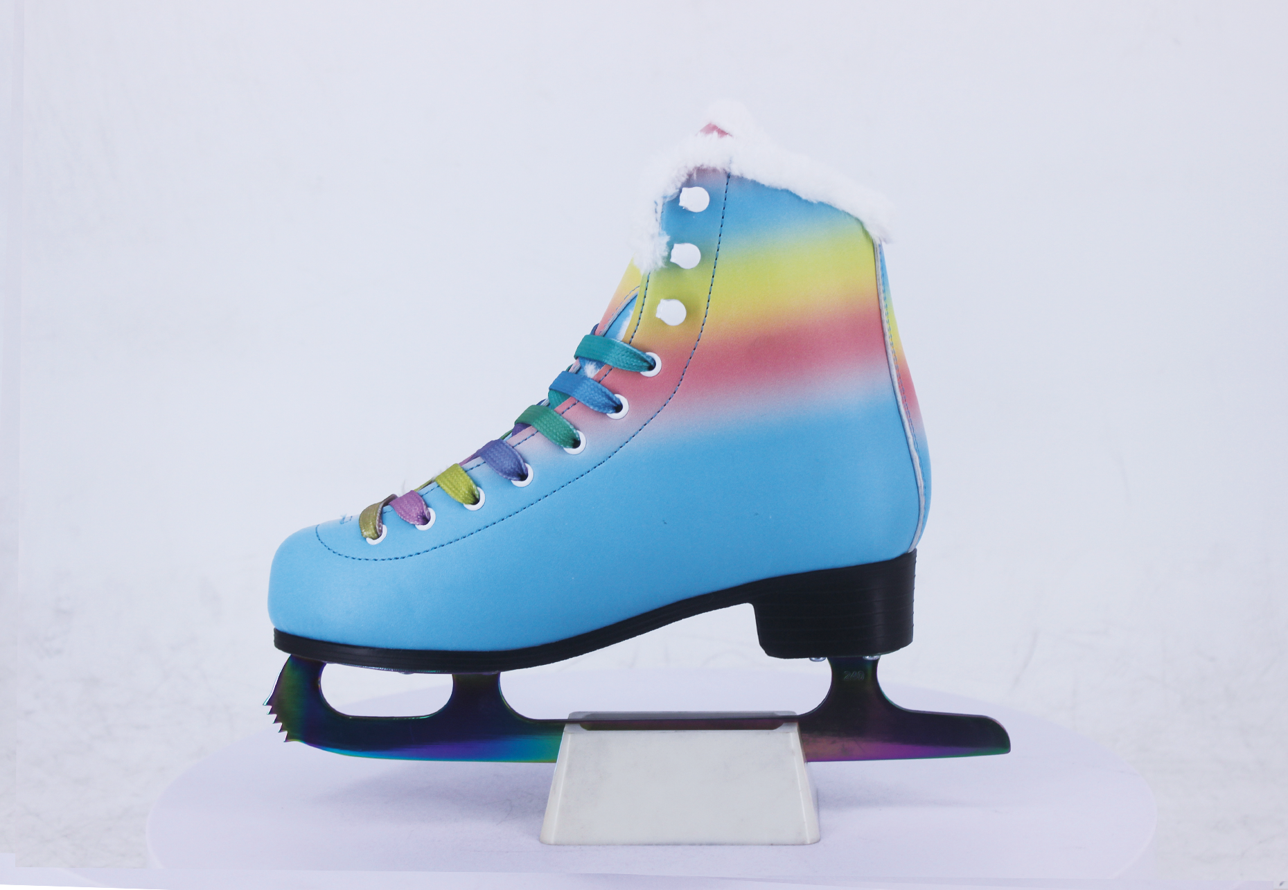 UT 207 Rainbow Figure Ice Skates feature a rainbow ombre PVC upper, anodized stainless steel blade, and cold-resistant construction to -20°C. EN15638 certified and designed for OEM figure skating supplies programs.